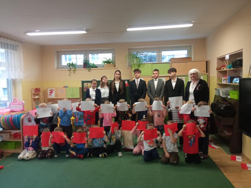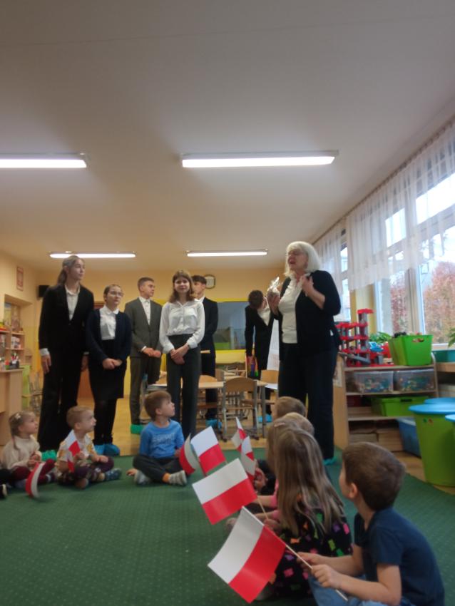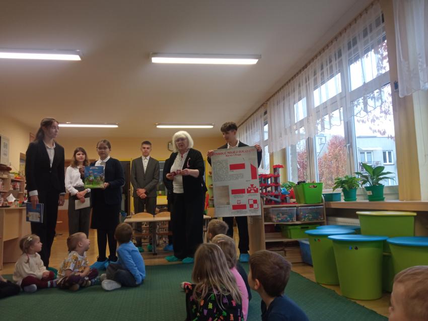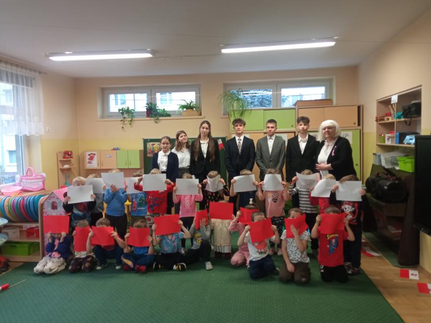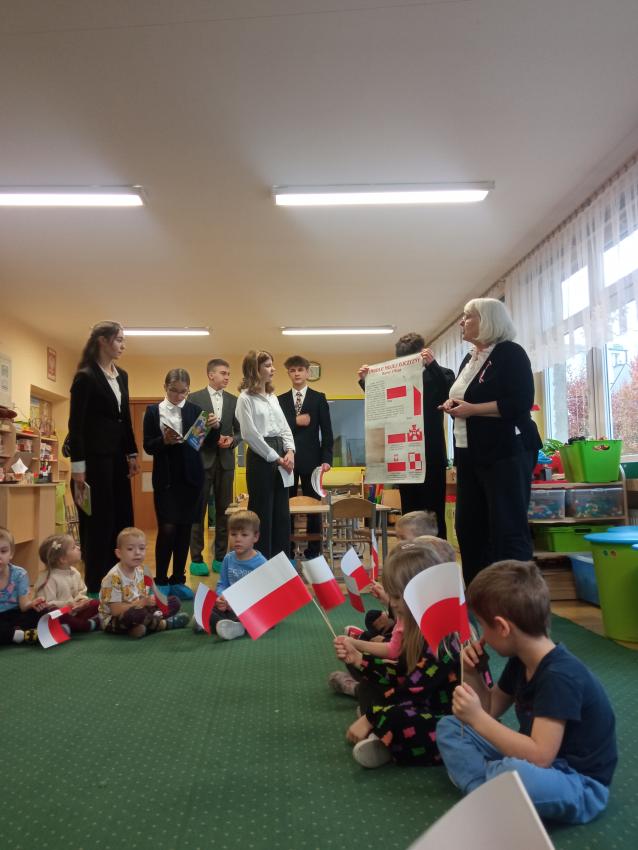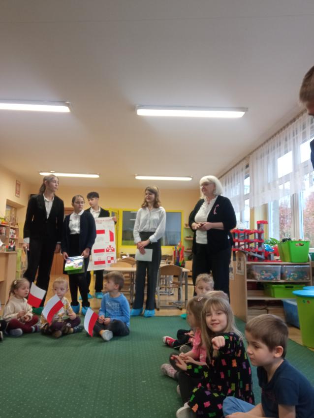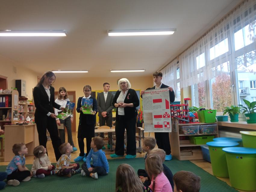 Uczniowie z klasy 7 i 8 Szkoły Podstawowej nr 113 w Krakowie odwiedzili nasze Przedszkole, rozmawiali z dziećmi na temat symboli narodowych, uczestniczyli w inscenizacji słowno-muzycznej przygotowanej przez dzieci z grupy V.