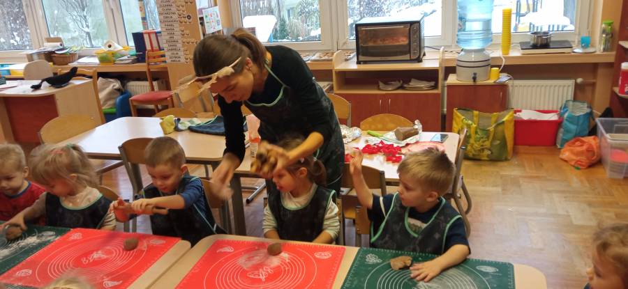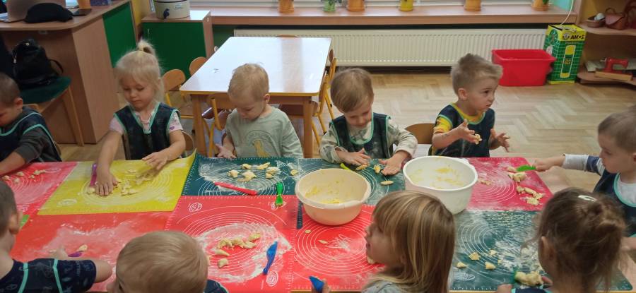 W naszym Przedszkolu po raz kolejny odbyły się warsztaty kulinarne. Tym razem dzieci miały okazję przygotowywać i dekorować pierniczki. Pani Ania zapoznała dzieci ze składnikami , które są potrzebne do zrobienia piernikowego ciasta. Następnie wszystkie produkty zostały dokładnie wymieszane, zagniecione i rozwałkowane ciasto, a później dzieci za pomocą foremek wycinały pierniczki. Na końcu była degustacja pierników.