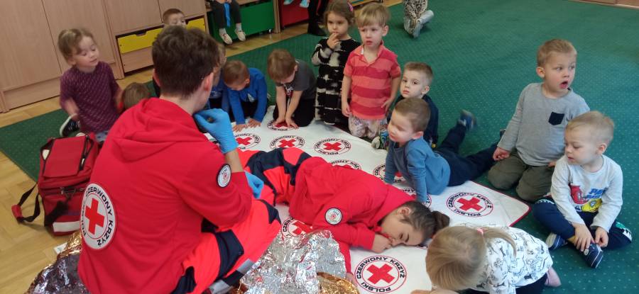 W listopadzie odwiedzili nasze przedszkole ratownicy medyczni. Przeprowadzili zajęcia udzielania pierwszej pomocy oraz prawidłowego zachowania w sytuacjach zagrożenia życia. Dzieci obserwowały jak wykonuje się sztuczne oddychanie. pozycję boczną ustaloną.
