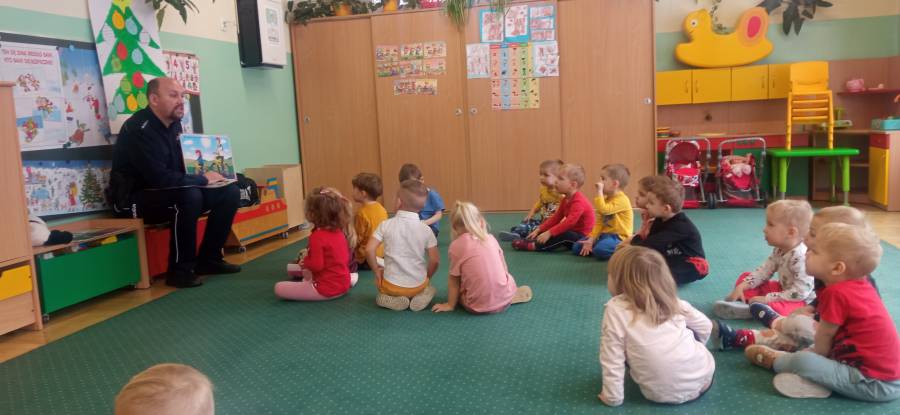 13 i 14 grudnia 2022 roku do naszego przedszkola przybył pan Policjant, który przybliżył dzieciom podstawowe zasady bezpiecznego poruszania się po drodze a także przypomniał o bezpiecznych zabawach w czasie zimy.